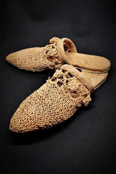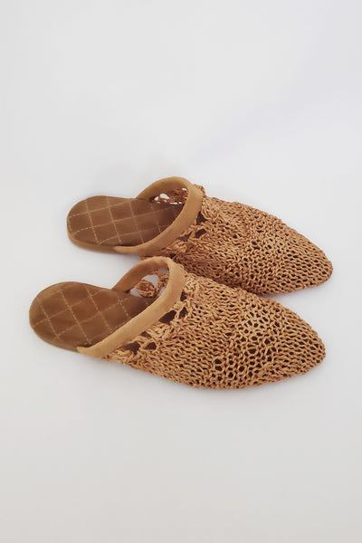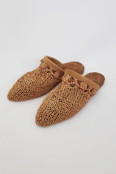 El yapımı sokak terliği. Camel renkli iç taban natürel kuzu süet kapitone kaplıdır, saya kısmı doğal rafya örgüdür. Basınçlı yıkama yapılarak , Aloe katkılı solüsyonla rafya ipler yumuşatılmıştır, parmakları rahatsız etmez. Yumuşak dokuludur, ayağa göre form alır.