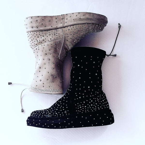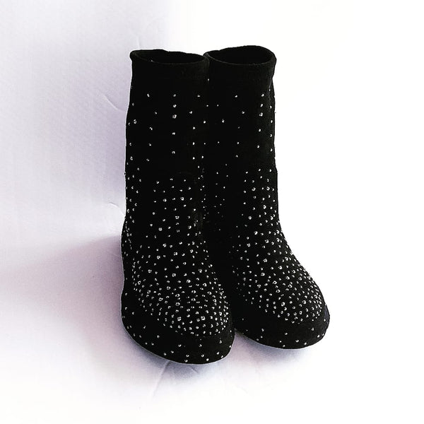 Micro süet taşlı bot. Konç kısmı esnektir , her bilek kalınlığına uyar. 4 cm topuk/platform boyu vardır. Vegan micro süet kadife görünümlüdür.